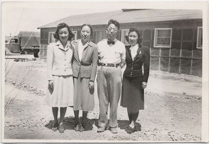 Then Pearl Harbor happened. Uchida’s father was detained, she heard of rural violence against Japanese American farmers, and she was herself accosted in a Berkeley restaurant by a Filipino American angry with the Japanese Army’s invasion of the Philippines. Her family was soon moved to an Oakland racetrack and then to Topaz, a dusty internment camp in Utah. Ucheda and her sister were released in 1943 to attend Smith College, but her parents remained at Topaz for the rest of the war. You can see the Ucheda sisters below, with their parents on the day they left the Topaz camp.